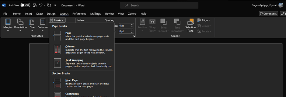 Place your cursor where you want to start a new page, this is particularly relevant for References lists in APA7 style, which requires the list to start on a new page.