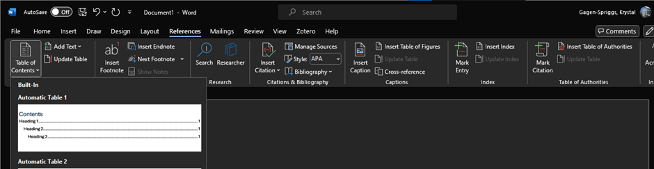 Go to the References tab in the Word Document Menu and click on Table of Contents. This will bring up the drop-down menu with choices of table styles.
