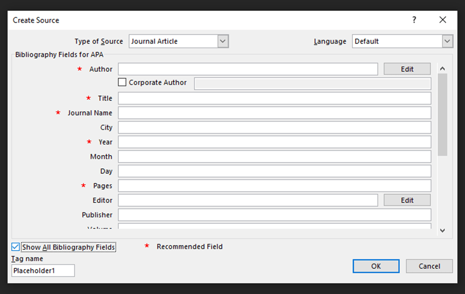 Fill in the information required. Please note that you will need to select ‘Show all bibliography fields’ to ensure you include all elements required by APA7.