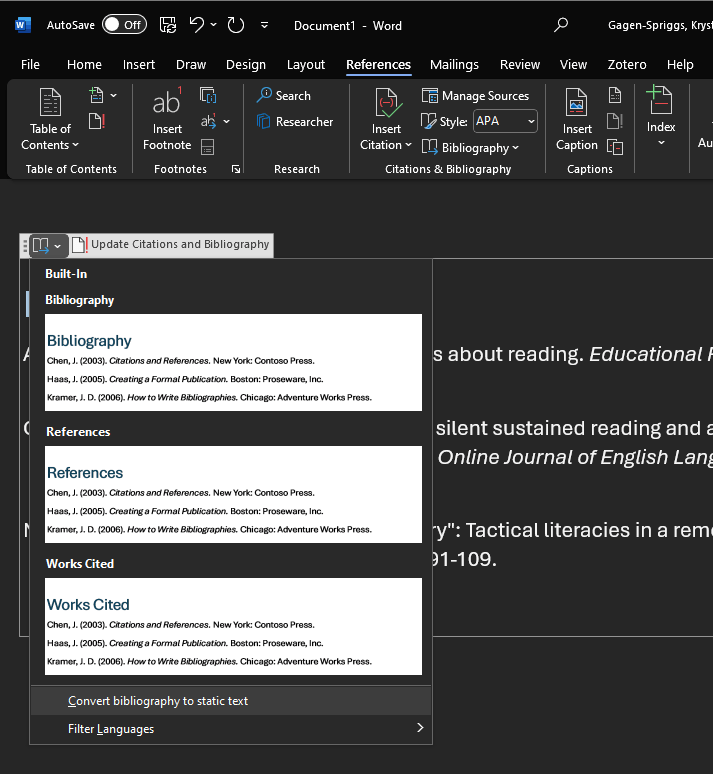 To turn the reference list to static text, click the title of the list, ‘References,’ and then click the ‘open book’ icon. From here, click the ‘Convert bibliography to static text’ option.