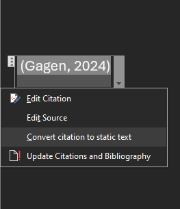 The conversion of in-text citations to static text needs to happen on a one-by-one basis, but follows the same principle: Click on the drop-down arrow, select ‘Convert citation to static text.’