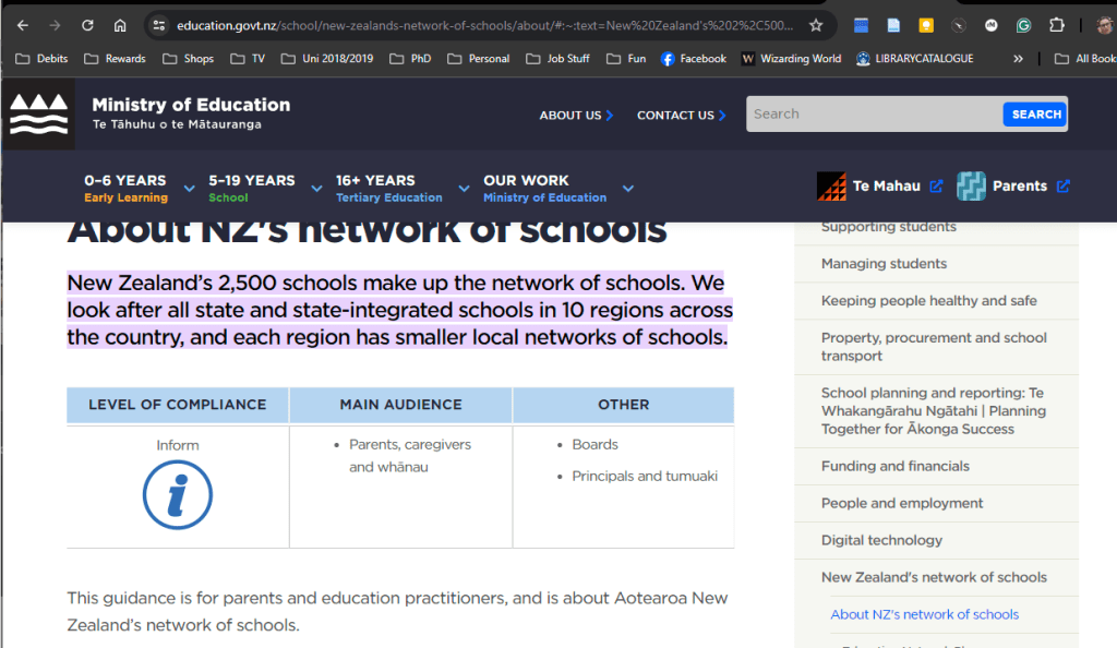 Ministry of Education. (2024, February 20). About NZ’s network of schools. Education in New Zealand. https://www.education.govt.nz/school/new-zealands-network-of-schools/about/#:~:text=New%20Zealand’s%202%2C500%20schools%20make,smaller%20local%20networks%20of%20schools.