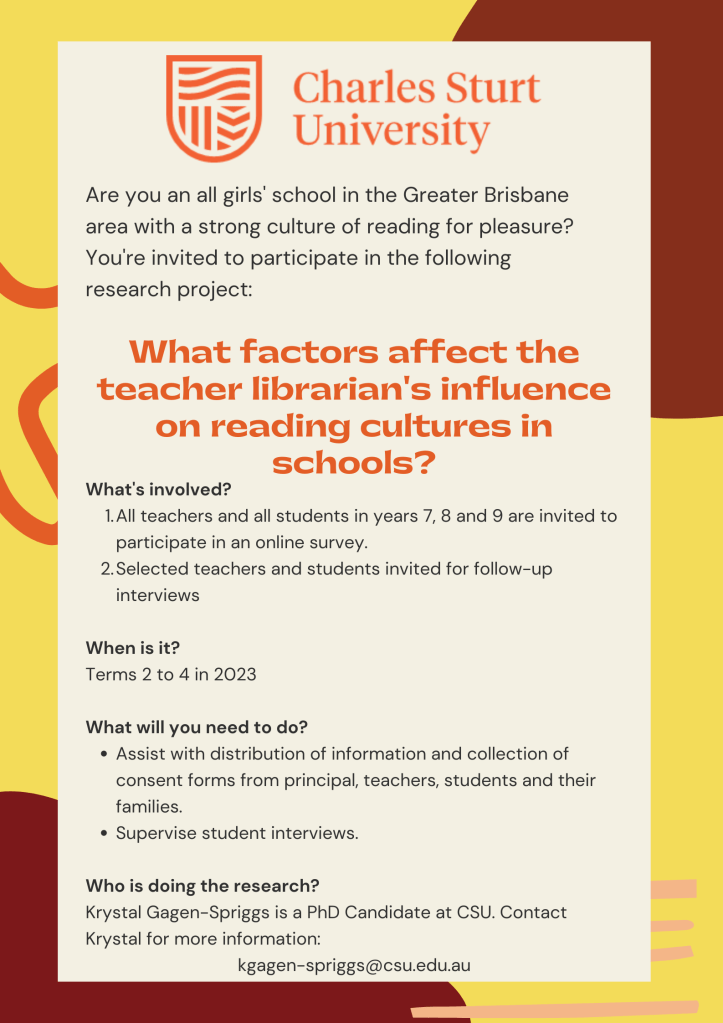 To answer this question, I am inviting all girls’ schools in the Greater Brisbane Area with students in years 7 to 12 to participate in my research. I will then select three schools for inclusion in my research project. All students in years 7 to 9 at these three schools and all teachers will be invited to participate in a survey on reading in their schools. From these surveys, I will select students and teachers for follow up interviews.